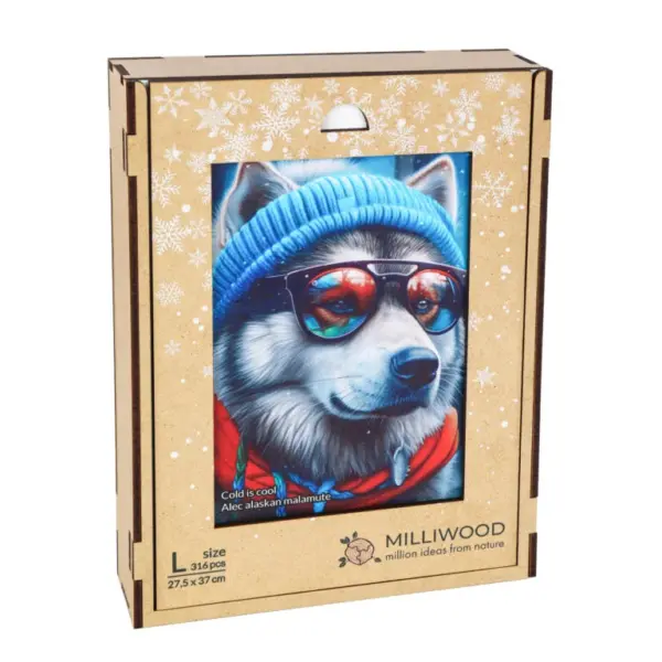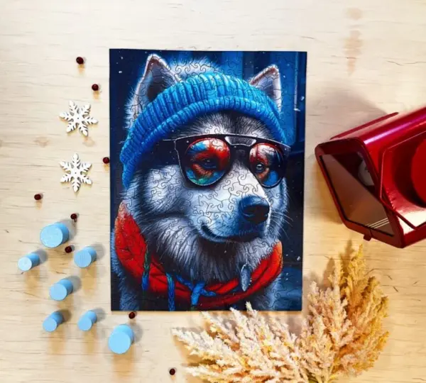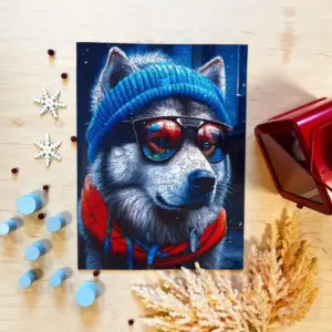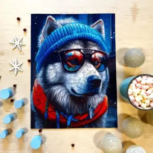 Alex nem csak egy malamut. Ő a tél embere: laza sapkájával, vastag sáljával és tükröződő napszemüvegével olyan, mintha egyszerre lenne felfedező, mókamester és stílusikon. A színei élénkek, mélyek, vibrálók — a hűvös kékek és jeges fehérek mellé tökéletesen simulnak a piros, narancs és lila tónusok.