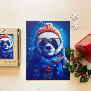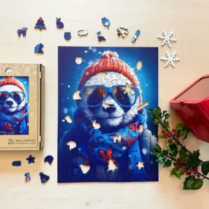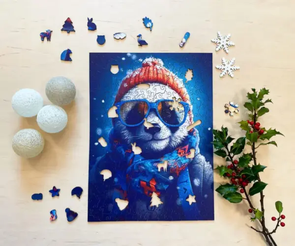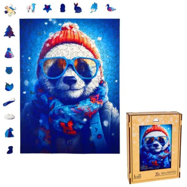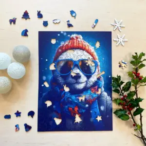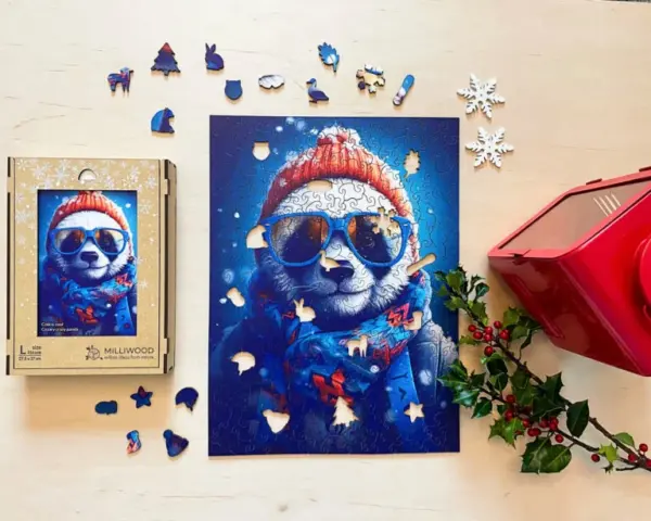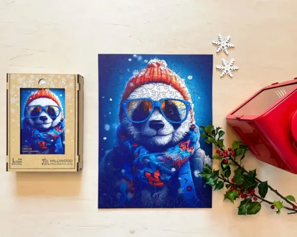 Ha létezik olyan panda, aki garantáltan feldobja a napodat, az biztosan Cezary. Ez a különleges fa puzzle nemcsak a hideg téli hangulatot hozza közelebb, hanem egy olyan karaktert elevenít meg, akire egyszerűen nem lehet nem mosolyogni. Cezary vagány napszemüvegével, kötött sapkájával és élénk mintás sáljával igazi stíluskirály, aki úgy néz rád, mintha azt mondaná: „Nyugi, megoldjuk ezt a napot, csak rakj ki!”