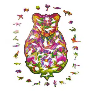 A kirakó elkészültével egy egyedi és élénk medve válik láthatóvá. A készlet 184 darabot tartalmaz, amelyek közül 30 ausztrál őshonos állatot ismerhetsz fel. Gyerekek és felnőttek egyaránt imádni fogják az eleven medvét. Így az együtt töltött időt az egész család évezi, és együtt lehet kreatív. Környezetbarát fából, kiváló minőségű, biztonságos festék felhasználásával készült. A darabokat nem lehet meghajlítani vagy összetörni, így sokáig élvezhetitek a játékot.