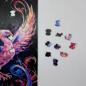 A Főnix fa puzzle újrahasznosítható, kiváló minőségű fából készül, precíz lézervágással. A darabok illeszkedése tökéletes, a felület sima és kellemes tapintású. Az UV-nyomtatott minták élénkek, mély tónusúak és hosszú távon is megőrzik színüket – a kész kép akár műalkotásként is megállja a helyét.