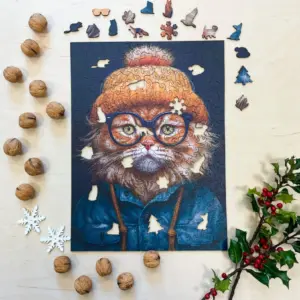 Giovanni nem csupán egy macska. Ő a vörös macska: egy igazi úriember, aki bundájának meleg árnyalataival, vastag kötött sapkájával és jellegzetes szemüvegével azonnal ellopja a szíved. „Giovanni, a vörös macska” egy különleges, részletgazdag fa puzzle, amely már az első darab megfogásakor egy bensőséges, meghitt hangulatot áraszt. Olyan élményt ad, mintha egy bájos, karakteres téli mesébe csöppennél.