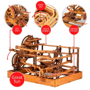 A 247 darabos készlet és a kézi hajtású szerkezet lehetővé teszi, hogy a fémgolyók a pályán kanyarogva ereszkedjenek, spirálban gyorsuljanak, majd egy fogasléces létra segítségével újra feljussanak a tetejére. Ez a modell nem csupán puzzle – ez egy mozgó mechanikai látványosság a polcodon.