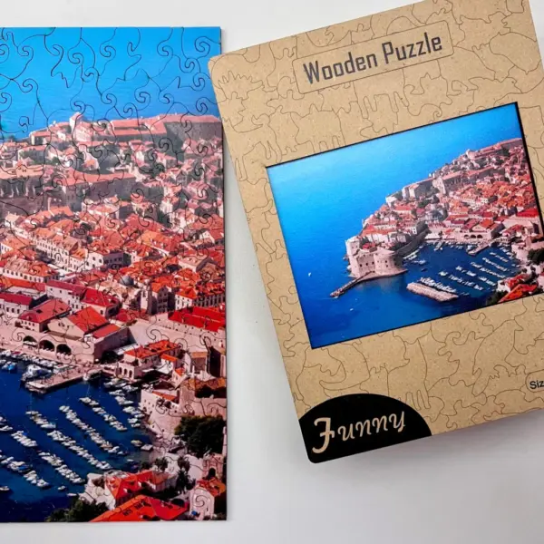 A Horvátország, Dubrovnik fa puzzle elrepít az Adriai-tenger partjára, a horvát városok legikonikusabbikába. A mediterrán napfényben fürdő vörös tetők, a történelmi városfalak és a tenger kéklő árnyalatai együtt alkotják a világ egyik legszebb látképét. A puzzle kirakása során szinte érezni lehet a sós levegőt, hallani a hullámok halk morajlását és a kikötő hajóinak neszezését.