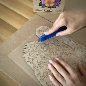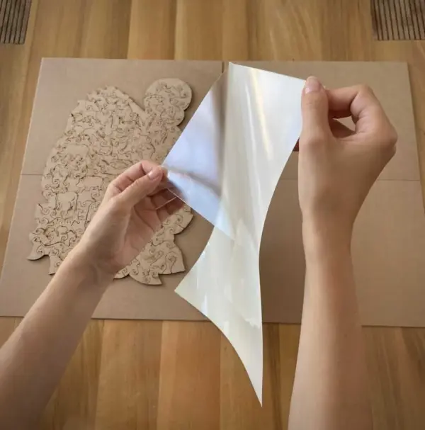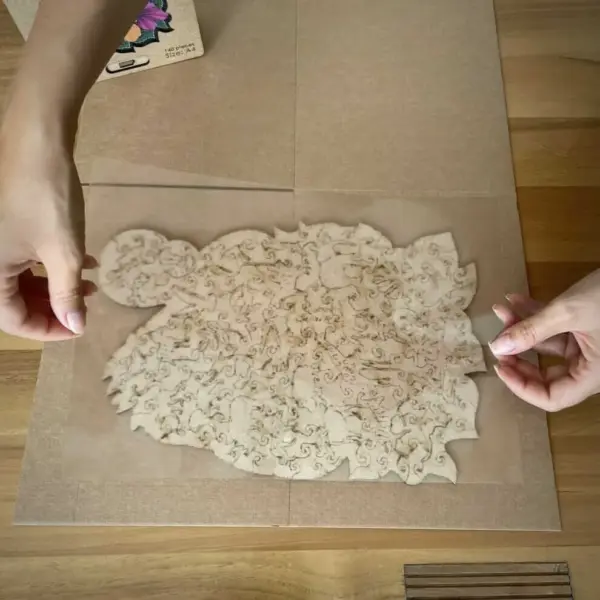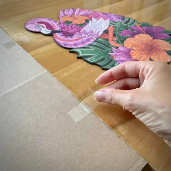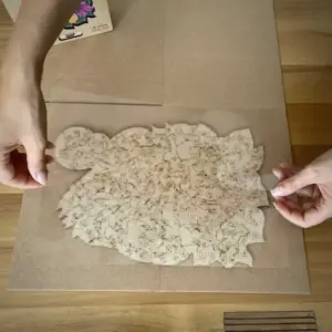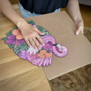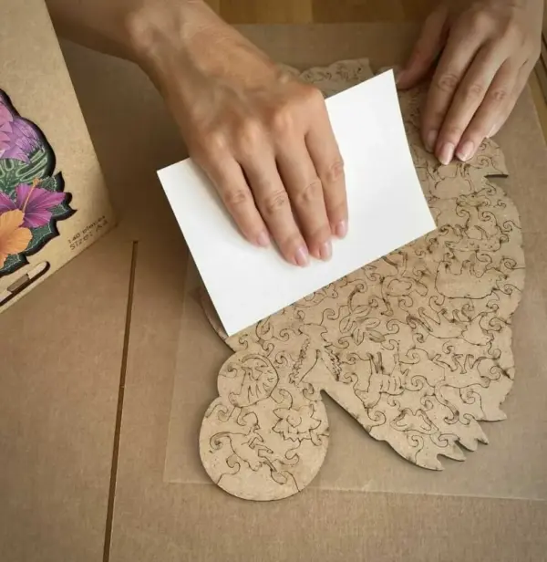 Két kartonpapírt találsz a csomagban, amelyekre rácsúsztathatod az összerakott kirakót, és megfordíthatod vele, hogy ragasztható legyen.