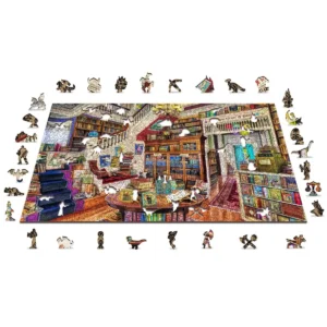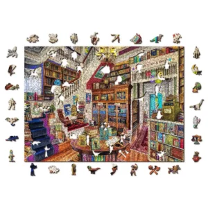 A könyvesbolt fa puzzle egy szeszélyes könyvtári jelenetbe invitál, egy olyan helyre, ahol a mesék és a tudás véletlenszerűen szétszórva várják a felfedezést.