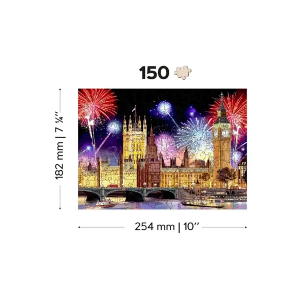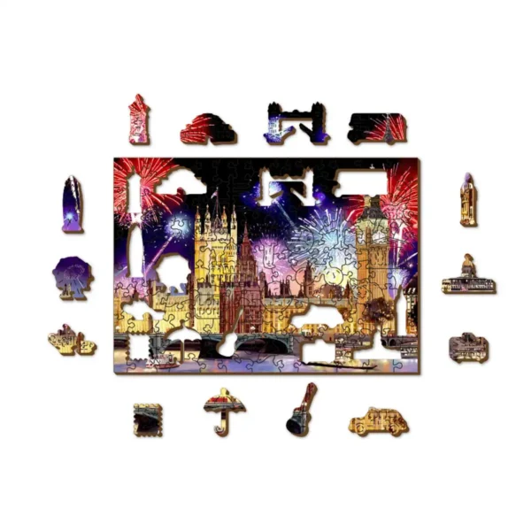 A London éjszaka fa puzzle egy igazi mestermű, amely London városának ikonikus szépségeit és vibráló éjszakai életét kelti életre. Ez a kirakó minden részletében visszatükrözi a brit főváros varázsát, ahol a történelem és a modern világ harmonikus egyensúlyban találkozik. A Westminster-palota, az időtlen Big Ben, a kivilágított hidak és a Temze felett ragyogó tűzijáték együttesen alkotják ezt a káprázatos éjszakai jelenetet.