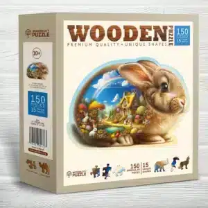 Kirakást követően a Ragyogó nyuszi fa puzzle szíve a gyönyörű nyuszi, amely egyszerre valósághű és fantáziadús. A nyuszi formája harmonikusan illeszkedik a természetes háttérbe, bundájának finom vonalai és árnyalatai magukban foglalják a tájat. Amikor ránézünk a nyuszira, azonnal egy varázslatos világba csöppenünk. A bundájában felsejlő idilli táj egy kis tó köré szerveződik, amelyet virágzó rétek és lágyan hullámzó dombok ölelnek körbe.