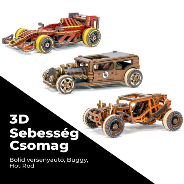 A Sebesség csomag az autórajongók álma – három ikonikus 3D fa jármű, amelyek a versenyzés világát és a mérnöki precizitást hozzák el otthonodba. 🏁