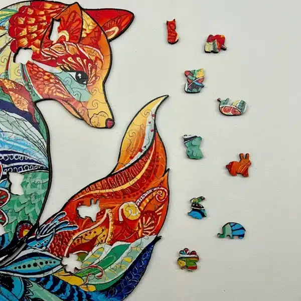 A puzzle darabjai prémium minőségű fából készültek, így időtállóak és kellemes tapintásúak. Az egyedi, lézerrel vágott elemek között különleges formák is megbújnak – állatok, virágok, levelek –, amelyek igazi meglepetést okoznak a kirakás során. Ezek a kis részletek teszik igazán egyedivé a puzzle-t, hiszen minden darab egy apró történetet mesél el, miközben a róka lassan életre kel a szemed előtt.