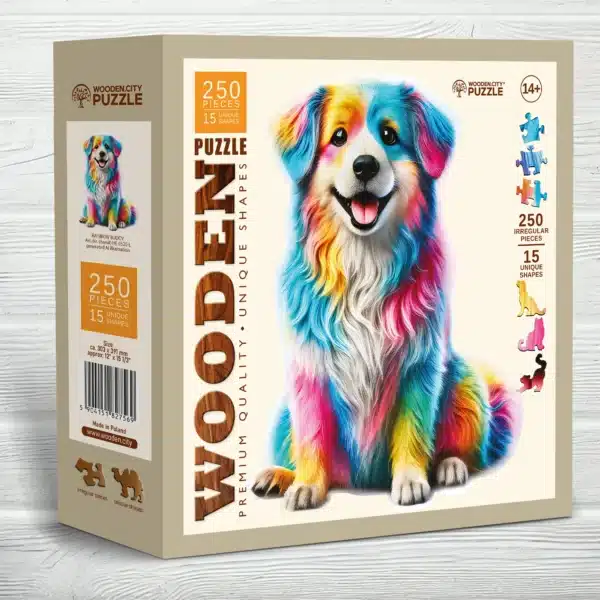 A bundája nem a megszokott árnyalatokban pompázik, hanem a szivárvány színeiben ragyog. A vörös, narancs, sárga, zöld, kék és lila árnyalatok fantasztikus harmóniában olvadnak össze, mintha maga a kutyus egy mesebeli világ része lenne. Ez a látványos és különleges színvilág igazán egyedivé és figyelemfelkeltővé teszi ezt a puzzle-t.