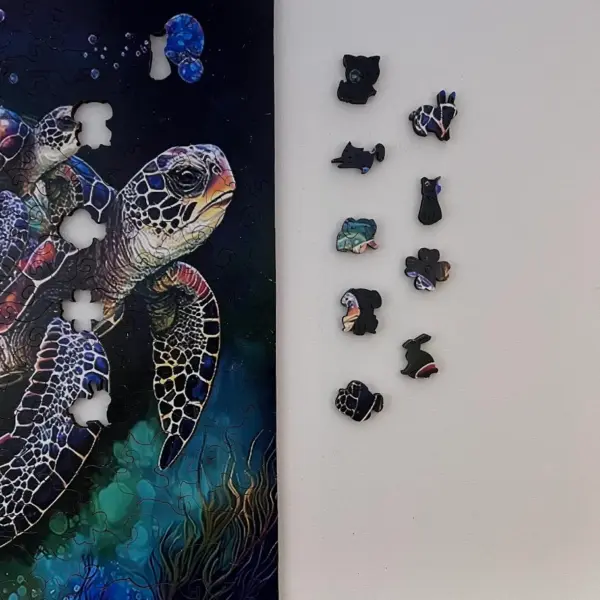 A puzzle képe a víz alatti világ szépségét tárja eléd. Élénk színeivel és részletes mintáival életre kelti a teknősöket, akik csendesen siklanak az óceán mélyén. Kirakás közben átélheted az óceán varázslatos hangulatát, és elmerülhetsz ebben a nyugodt, békés világban.