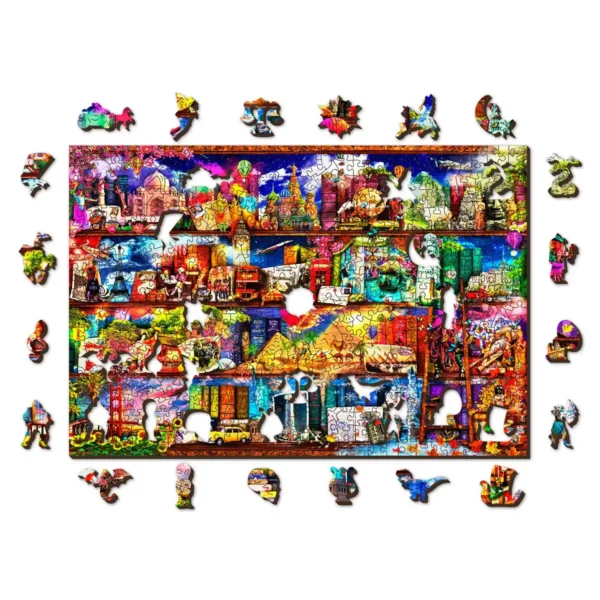 Indulj el egy kellemes utazásra a World Travel Bookshelf 500 fapuzzle segítségével. Fedezd fel a Földet otthonod kényelméből, és merülj el a globális nevezetességek és élővilág varázslatos világában.