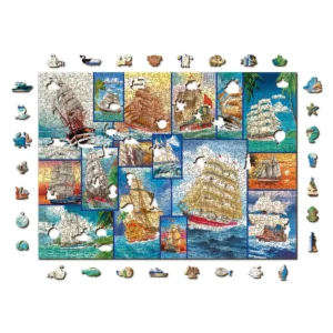 A Vitorlás hajók fa puzzle vizuális utazást kínál a hatalmas óceánokon és tengereken keresztül, különböző vitorláshajókat ábrázolva, amelyek kalandos útjukat járják.