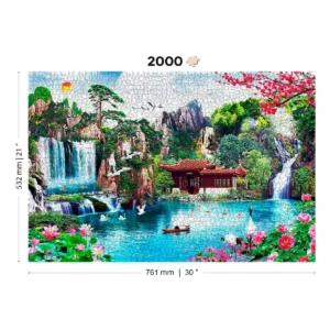 A Vízesések a japánkertben egy lenyűgöző fa puzzle, amely egy mesebeli japán tájat ábrázol. A kirakott kép egy hegyek között megbúvó, hagyományos japán házat mutat be, amelyet békés vízesések és gazdag növényzet vesz körül. A természet és az építészet tökéletes harmóniája érezhető minden apró részleten – a lassan hömpölygő vízen hattyúk siklanak, a halak kecsesen ugranak ki a felszínre, a fák és a vízililiomok pedig a természet pompáját tükrözik.